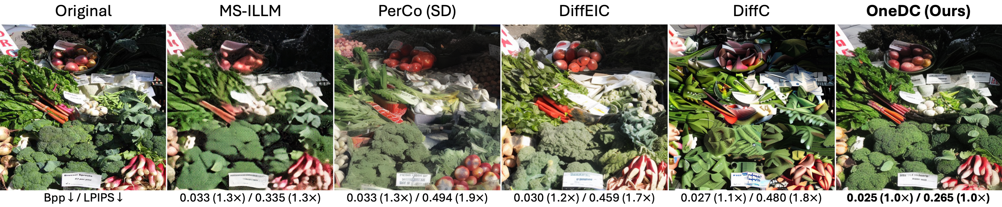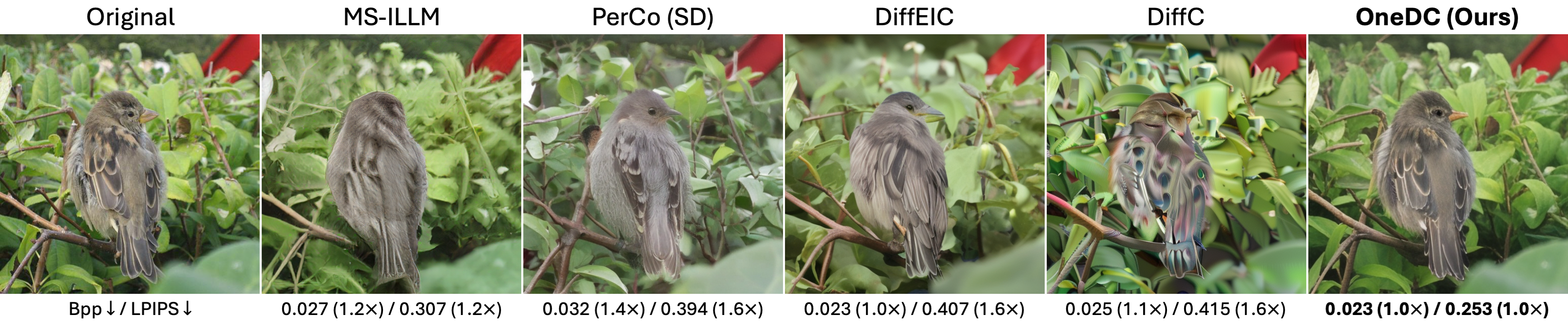 OneDC can compress images to text-level size (a 768x768 image with 0.24KB), but the reconstruction still retains strong semantic consistency and original spatial details.